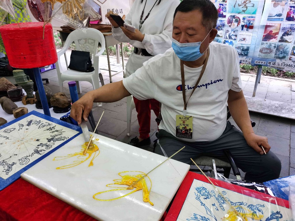 距離魁氏燒鍋釀造技藝展柜還有一段距離,就能聞到濃郁甘醇的酒香,流水宴賓朋的造型吸引了一大批酒文化愛好者駐足;姚氏糖畫技藝展柜旁,圍了不少小朋友和“大朋友”,“我小時候特別迷牡丹江市愛民區(qū)兒童公園旁邊賣的糖畫,每次路過都央求爸爸給我買個‘龍’,活靈活現(xiàn)的!”市民回憶說。
