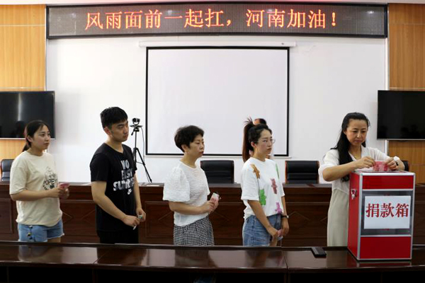 7月23日上午,捐款儀式在辦公樓五樓會議室舉行,干部職工紛紛慷慨解囊,50元、100元、200元……一份份愛心在這里匯聚傳遞。災害無情,人有情,參加捐款的干部職工一起在“風雨面前一起扛,河南加油!”的條幅上簽名,表達自己的心情,為河南人民加油打氣。目前,捐款款項已匯至紅十字會。