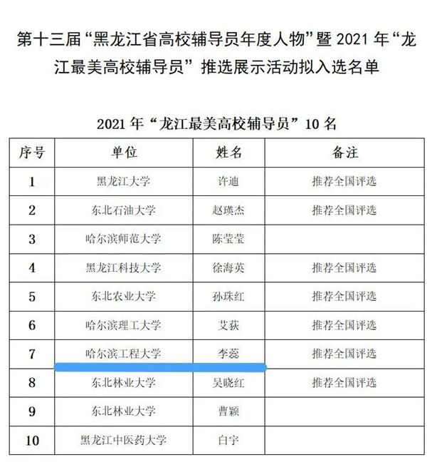 此次活動共評選出“第十三屆黑龍江省高校輔導(dǎo)員年度人物”11名,“2021年龍江最美高校輔導(dǎo)員”10名。哈工程輔導(dǎo)員梁艷艷、李蕊憑借高水平的專業(yè)能力、優(yōu)異的工作業(yè)績以及認(rèn)真負(fù)責(zé)的工作精神,在眾多評選者中脫穎而出。
