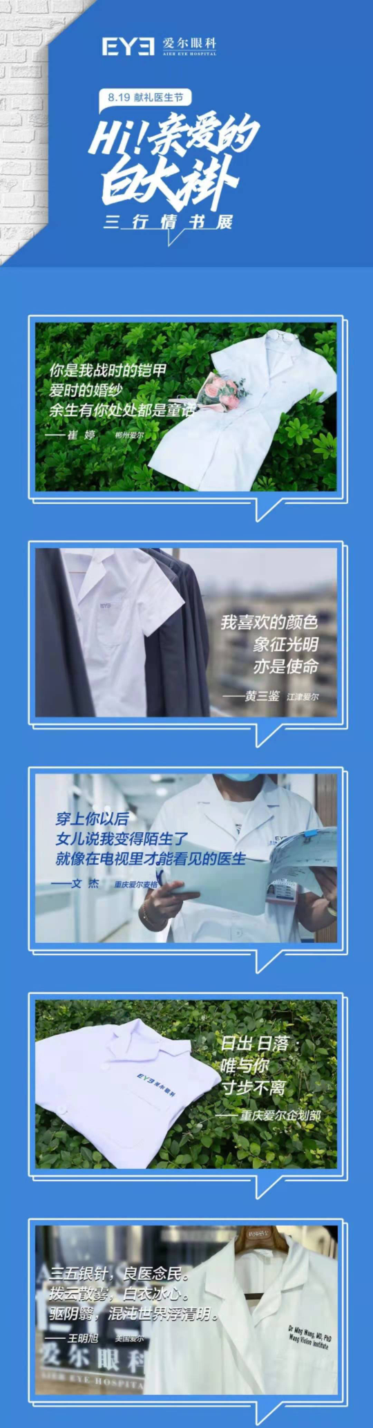 除了溫情脈脈、感動滿滿的系列微電影,愛爾眼科還啟動了醫(yī)師節(jié)“三行情書”征集活動。溫柔細致、多才多藝的醫(yī)生們,用他們或細膩、或豪放的筆觸,寫下了自己對“白大褂”真摯的情感。活動開展以來,共收到海內外情書作品近2000件,最終此次活動共評選出“最美情書”、“最佳告白”共100個優(yōu)秀作品。(愛爾眼科)