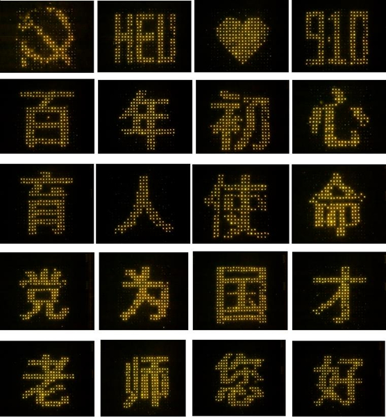 黨徽、HEU(哈工程縮寫)、愛心、9.10、百年初心、育人使命、為黨育人、為國育才、老師您好……同學們匯聚力量共同拼出了24組圖案和字樣,即使天空飄起毛毛細雨,他們也絲毫沒有變換位置,在雨中足足站了兩個小時。2021級博士生王文軒感慨:“作為一名本、碩都就讀于哈工程的學生,這所大學的老師教會了我如何做人做事做學問,我們用這場燈光秀,獻禮我們最尊敬的老師,我們也一定會傳承哈軍工精神,勇?lián)鷱妵倌晔姑鼡?。?/span>