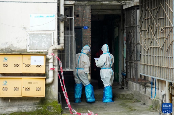 11月4日,在重慶九龍坡區(qū)九龍街道,兩名身穿防護服的青年志愿者準(zhǔn)備入戶核對信息。