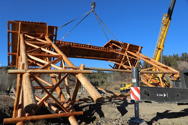 阿木爾林業(yè)局薩布素景區(qū)的薩布素軍馬場大門被緩緩起吊起來(王力/攝)