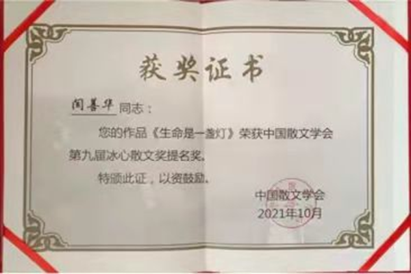 在幾十年的文學(xué)創(chuàng)作和編輯工作中,她不斷堅持學(xué)習(xí)提高,筆耕不輟,執(zhí)著堅守。在2020年10月發(fā)表在《北極光》上的散文《生命是一盞燈》,因主題對生命的感悟,用縱橫寬泛的思路、真摯的情感,流暢的文筆,經(jīng)評委嚴(yán)格評審,最終脫穎而出,獲得本屆冰心散文獎單篇提名獎。這對于一直深居邊陲縣城的一名作家,能邁進(jìn)冰心散文獎這中國散文最高獎的大門,是一個非常難得的殊榮。