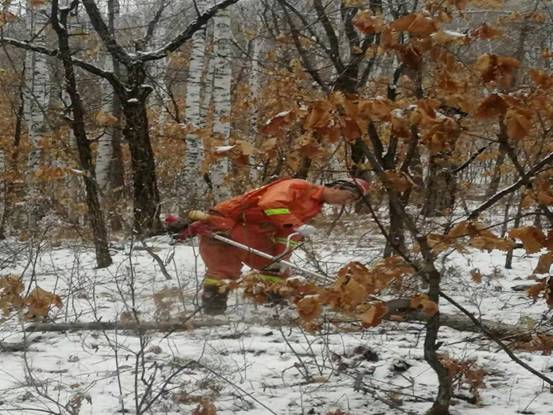 在經(jīng)過一段緊張嚴(yán)格的產(chǎn)前技能及安全培訓(xùn)后,紅星林場(chǎng)職工們備齊生產(chǎn)工具和防護(hù)物品,每天頂著未褪盡的夜色出發(fā),天剛冒亮就開工,在積雪覆蓋的林間不停穿行,鋸手手持割灌機(jī)把作業(yè)規(guī)程要求的各類林內(nèi)枯死、風(fēng)折枝干伐除,后面的歸堆工緊隨其后,把割下的枯干枝條有序的理順碼成堆。各小組分工明確,配合嫻熟,漫山雜亂的倒木藤條在工人們的手下被梳理的清晰利落,寂靜的山林也在機(jī)器的轟鳴和工人們的笑聲中熱鬧起來(lái)。