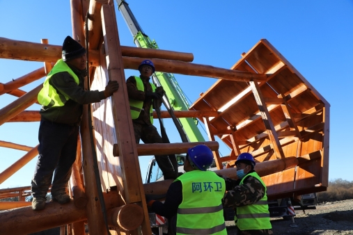 阿木爾林業(yè)局環(huán)衛(wèi)隊黨員干部職工正在安裝薩布素軍馬場大門(王力 攝)