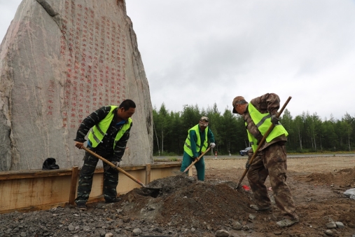 阿木爾林業(yè)局環(huán)衛(wèi)隊黨員干部職工為林業(yè)局在西出口路新建的地標(biāo)打地基(王力 攝)