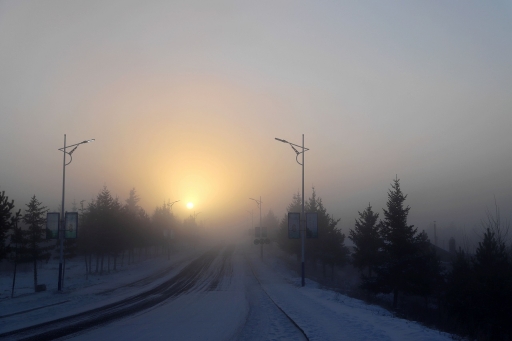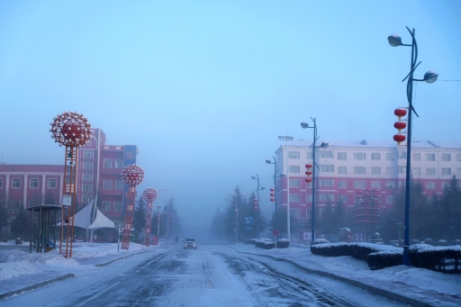 早晨7點(diǎn)30分,阿木爾林業(yè)局天剛蒙蒙亮,遠(yuǎn)處的群山不見(jiàn)了蹤影,籠罩在寒霧當(dāng)中,附近的建筑物影影綽綽,仿佛仙境一般,這種寒霧天氣被百姓成為“冒白煙”。