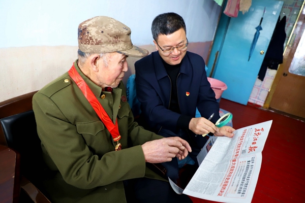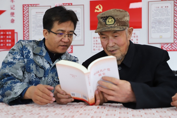 阿木爾林業(yè)局黨委委員、組織部部長王立昆與退休老黨員張俊峰共同學(xué)習(xí)黨史(王力 攝)