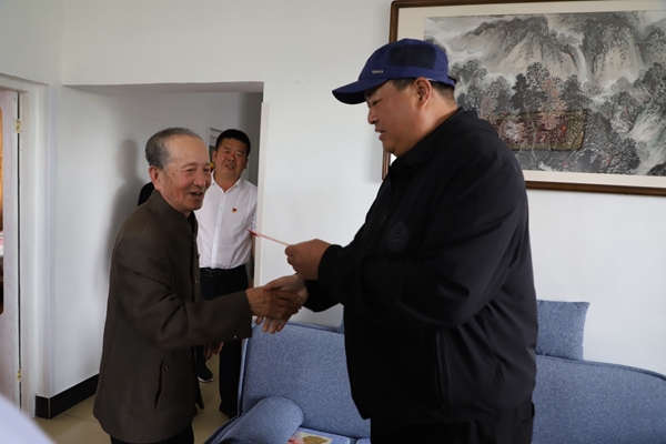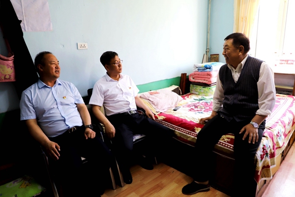 阿木爾林業(yè)局黨委書記胡守慶(右一)春節(jié)走訪慰問退休老干部鄭德坤(王力 攝)