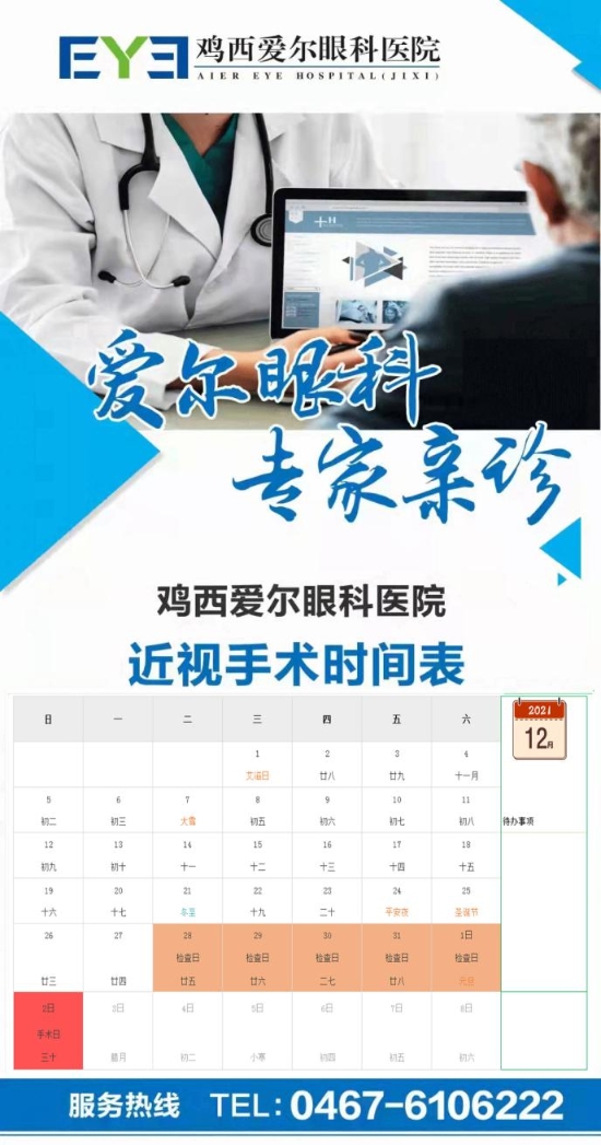 雞西愛爾眼科醫(yī)院近視手術時間表: