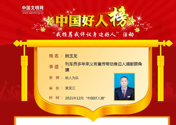 騰玉龍,鐵力市人,曾先后榮獲“龍江好人”“伊春好人”“最美鐵力人”等榮譽稱號。他曾多次捐贈造血干細(xì)胞,挽救了3個人的生命。在他的帶動下,他的家庭成為中國首個眼角膜、身體器官和造血干細(xì)胞捐獻(xiàn)志愿者家庭。騰玉龍同志入選2021年12月“中國好人榜”后,鐵力市精心組織策劃,動員廣大干部群眾為典型點贊助力,組織全市各單位、各社區(qū)居民學(xué)習(xí)“中國好人”先進(jìn)事跡。