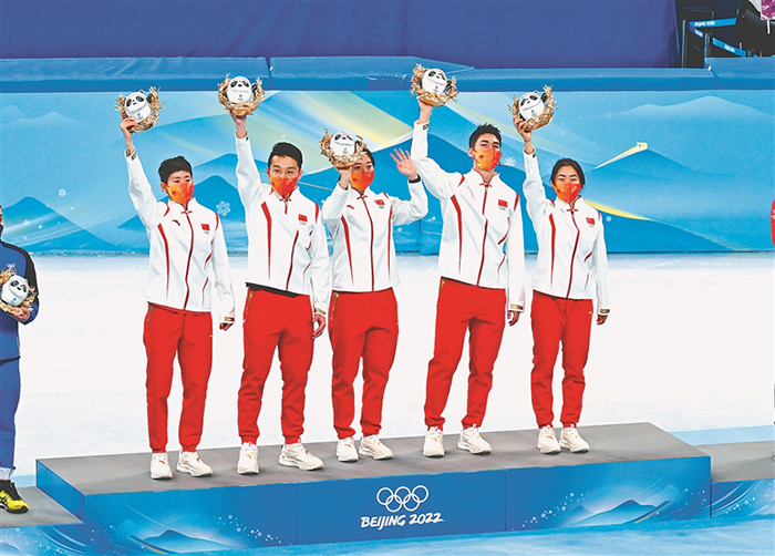 2月5日,中國隊(duì)選手在頒獎儀式上。 黑龍江日報全媒體特派記者 郭俊峰攝