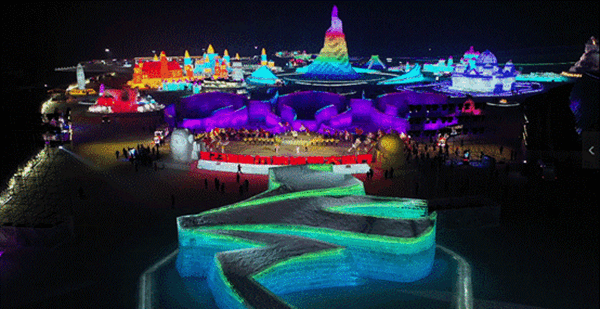 在30分鐘的暖場表演中,黑龍江哈爾濱、新疆阿勒泰、江蘇南京、廣東深圳等地舉行了慶祝活動,并以連線的方式與暖場演出進(jìn)行互動。其中,哈爾濱的互動表演節(jié)目現(xiàn)場,選在了被譽(yù)為“黑龍江冰雪旅游名片”的哈爾濱冰雪大世界。