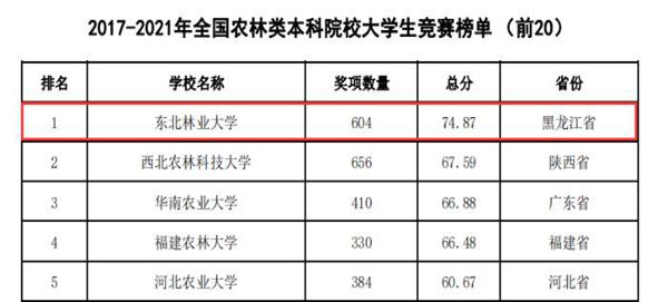 黑龍江經(jīng)濟網(wǎng)訊(黑龍江日報全媒體見習(xí)記者董廣碩 商祺)近日,中國高等教育學(xué)會高校競賽評估與管理體系研究工作組發(fā)布2021全國普通高校大學(xué)生競賽分析報告,在《2017-2021年農(nóng)林類本科院校大學(xué)生競賽排行榜TOP20》中。東北林業(yè)大學(xué)以總分74.87(獲獎604項)的優(yōu)異成績連續(xù)四年蟬聯(lián)榜首。