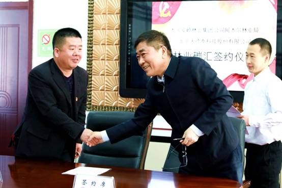 阿木爾林業(yè)局副局長李玉峰與北京天得泰科技股份有限公司副董事長、專家委員會(huì)主席孫樹鎖相互握手,慶賀簽約文本,開啟碳匯經(jīng)濟(jì)產(chǎn)業(yè)發(fā)展之路(王力 攝)