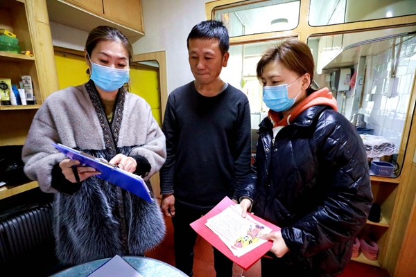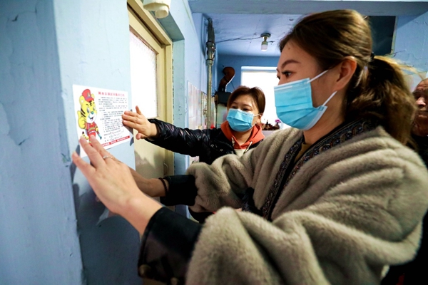 阿木爾社區(qū)志愿者王春草(右)、李建靜(左)走進(jìn)居民周家讓家中,提醒居民注意防火,并在醒目處張貼《防火公約》(王力 攝)