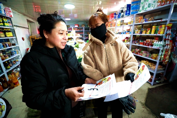 阿木爾社區(qū)志愿者王春草(左一)、李建靜(右一)深入到何忠智經(jīng)營(yíng)業(yè)戶,宣傳《森林法》,增強(qiáng)居民法律意識(shí)(王力 攝)