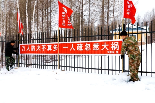 紅旗林場(chǎng)職工在第一管護(hù)站掛宣傳防火宣傳條幅(王力 攝)