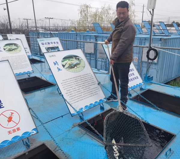 在良莊農(nóng)業(yè)科技園里,一排排藍(lán)色集裝箱,以及寫著“養(yǎng)殖箱體全程模擬自然生態(tài)環(huán)境,還您江湖魚的味道”等字樣的標(biāo)牌,別有一番趣味。記者了解到,這里是一個(gè)智慧漁場,裝滿水的集裝箱則是鱘魚、鱸魚、鯽魚等的“家園”,打開一個(gè)集裝箱的頂部,三五成群的魚兒在約15平方米的水里游來游去。