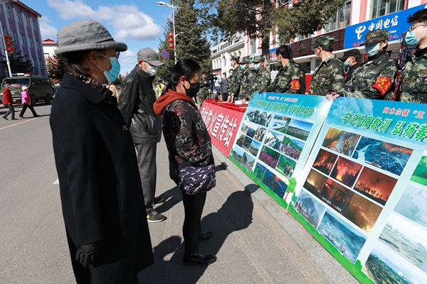 阿木爾林業(yè)局職工群眾在觀看“五·六”反思宣傳圖片展(王力 攝)