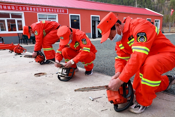 阿木爾林業(yè)局綠林林場(chǎng)專業(yè)撲火隊(duì)員在進(jìn)行風(fēng)力滅火機(jī)、油鋸的拆裝維修使用比賽(王力 攝)