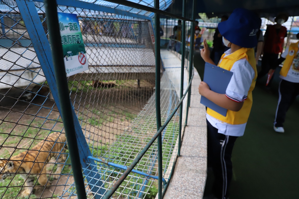 在東北虎林園工作人員的帶領(lǐng)下,小朋友們穿著統(tǒng)一的黃馬甲,手持研學(xué)游活動記錄單,充滿期待地走進東北虎林園,近距離觀察動物們的外貌特征、動作特點,細致聆聽工作人員的講解,認(rèn)真記錄自己所看到的每一個細節(jié)、聽到的每一個知識,還有愛畫畫的小朋友畫下了自己親眼所見的老虎憨態(tài)可掬的樣子。