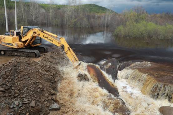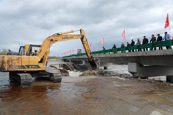 阿木爾林業(yè)局調(diào)派大型機(jī)械設(shè)備,挖開(kāi)楚龍溝河大橋臨時(shí)便道,進(jìn)行泄洪,確保G111國(guó)道安全(王力 攝)