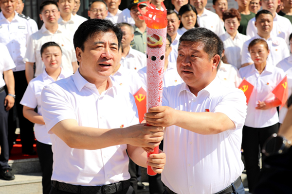 塔河林業(yè)局黨委書(shū)記許曉光,塔河縣委副書(shū)記、縣長(zhǎng)宋波共同啟動(dòng)“黨建接力·紅色打卡”黨建共建火炬接力活動(dòng);塔河縣委常委、組織部部長(zhǎng)婁喜春將火炬?zhèn)鬟f給火炬接力第一棒代表隊(duì)隊(duì)長(zhǎng)、黨委委員、組織部部長(zhǎng)寧洪力手中。
