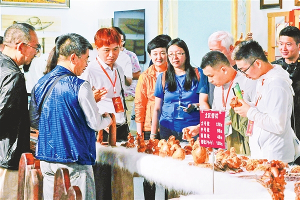 網(wǎng)絡(luò)名人在永達(dá)木藝參觀北沉香工藝品(胡錫韋/攝)。