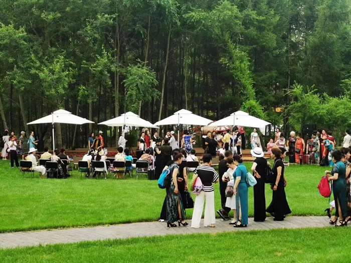在文化創(chuàng)意園的核心位置,有一處面積為131.14平方米的半月?tīng)钌治枧_(tái)。4000株大海棠花從2米高的創(chuàng)意作品啤酒筒潑灑而出,蜿蜒“流淌”。此景名為《森林飛花》,與森林舞臺(tái)交相呼應(yīng),相得益彰。