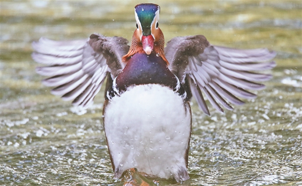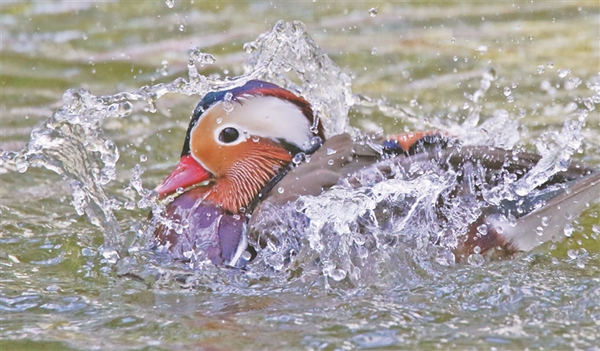 每天早晚,車(chē)春虎都會(huì)把準(zhǔn)備好的麻籽、玉米、面包蟲(chóng)等鳥(niǎo)食撒到湖上、岸邊,鴛鴦撒著歡覓食。吃完食兒,它們不時(shí)水上舒展羽翅,撲騰戲水,湖面上水花四濺,生機(jī)盎然。車(chē)春虎介紹,這些鴛鴦?wù)跒槟线w越冬做著體能儲(chǔ)備,每年10月中下旬它們就會(huì)離開(kāi)繁殖地哈爾濱,飛到溫暖的南方越冬。