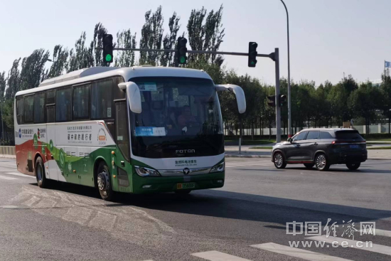 道路上行駛的氫燃料客車(姜智文/攝)。