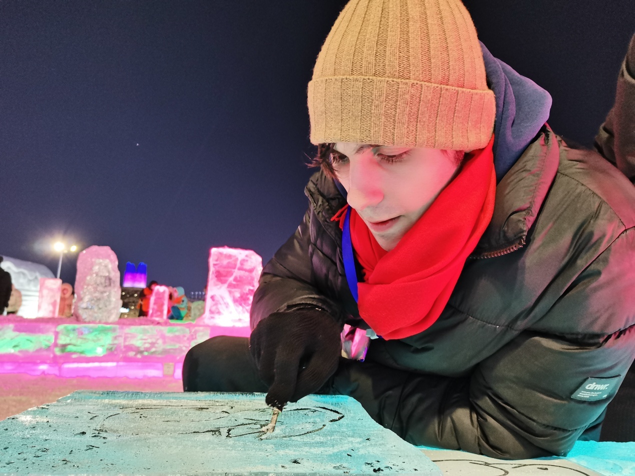 傍晚,中外青少年在流光溢彩、美輪美奐的哈爾濱冰雪大世界中感知冰雪藝術(shù)的魅力。在冰雪藝術(shù)體驗(yàn)營(yíng)聆聽冰雕制作過(guò)程,學(xué)習(xí)將冰與中國(guó)傳統(tǒng)木刻版畫相結(jié)合,親手設(shè)計(jì)制作屬于自己獨(dú)一無(wú)二的冰版畫,體驗(yàn)冰雪帶來(lái)的樂趣。