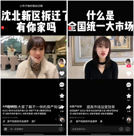 “現(xiàn)在整個(gè)沈陽(yáng)房產(chǎn)市場(chǎng)30%的成交額都是由快手主播提供的,當(dāng)?shù)氐拈_(kāi)發(fā)商們也會(huì)經(jīng)常和快手平臺(tái)、快手主播合作宣傳,平臺(tái)對(duì)于房產(chǎn)行業(yè)的約束,也帶著當(dāng)?shù)胤慨a(chǎn)市場(chǎng)向更加正規(guī)化方向發(fā)展”。