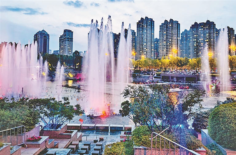 夏日夜晚,哈爾濱市群力金河公園音樂谷內,伴隨著悠揚的樂曲,大型噴泉“翩翩起舞”,與霓虹彩燈交相輝映,構成一幅美麗的畫面。