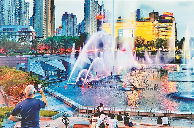 一邊觀賞著美麗的噴泉景觀,一邊享受著夏日清涼,市民、游客紛紛圍坐在四周,用手機記錄下精彩瞬間。
