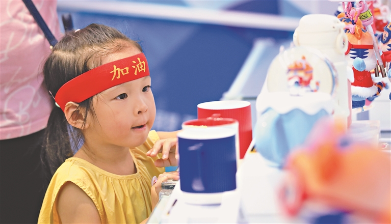 6月29日,第九屆亞冬會(huì)特許零售店哈爾濱索菲亞教堂店,游客在琳瑯滿目的貨品中挑選心儀的款式。