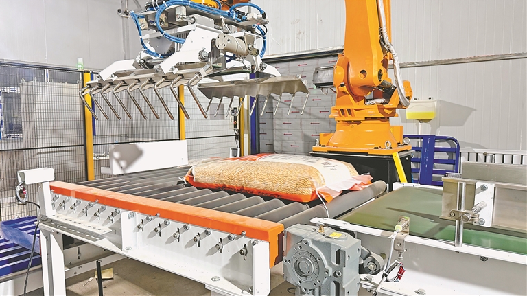楊旭升介紹:“我們基地今年新增加全自動封袋機、全自動機械手臂,實現(xiàn)全自動封袋包裝、碼垛功能,也可實現(xiàn)24小時不間斷加工作業(yè),提高種子加工速度的同時,大大節(jié)省勞動力,節(jié)省空間,提高生產(chǎn)效率?!?/p>