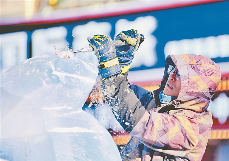 四五名工匠在現(xiàn)場(chǎng)忙碌,有的在切割冰塊,有的在精心雕琢,有的在清掃濺落的冰屑。