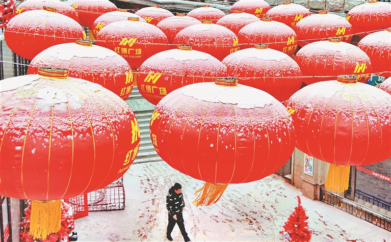 7日,臘八節(jié),哈爾濱市迎來降雪天氣。在白雪映襯下,街邊和廣場上懸掛的大紅燈籠更顯喜慶。街上的行人紛紛拿出手機拍下精彩瞬間。在一些市場內(nèi),銷售臘八粥、臘八蒜的攤位擠滿了消費者,生意十分紅火。