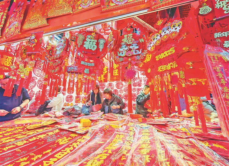 春節(jié)臨近,哈爾濱市道里區(qū)一處批發(fā)市場(chǎng)內(nèi),市民們正在購(gòu)買各種節(jié)日飾品,用來(lái)裝點(diǎn)家居,迎接新春佳節(jié)的到來(lái)。蛇年主題的燈籠、對(duì)聯(lián)、福字等擺滿了柜臺(tái),紅紅火火,喜慶氣氛濃厚。人們臉上都洋溢著幸福的笑容,一邊逛一邊買,個(gè)個(gè)滿載而歸。
