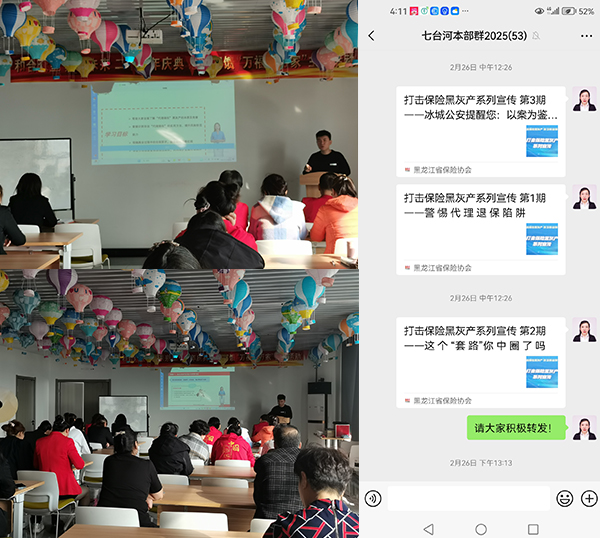 在此次打擊“代理退?!毙麄骰顒又?,七臺河中支利用微信工作群、微信朋友圈轉發(fā)宣傳內容,詳細剖析了黑灰產(chǎn)的常見運作模式,非法“代理退保”可能給消費者帶來的四方面風險:一是資金受損風險;二是喪失正常保險保障的風險;三是個人信息泄漏風險;四是相關行為可能導致消費者面臨訴訟等法律風險。號召廣大群眾增強風險防范意識,警惕非法“代理退保”套路。