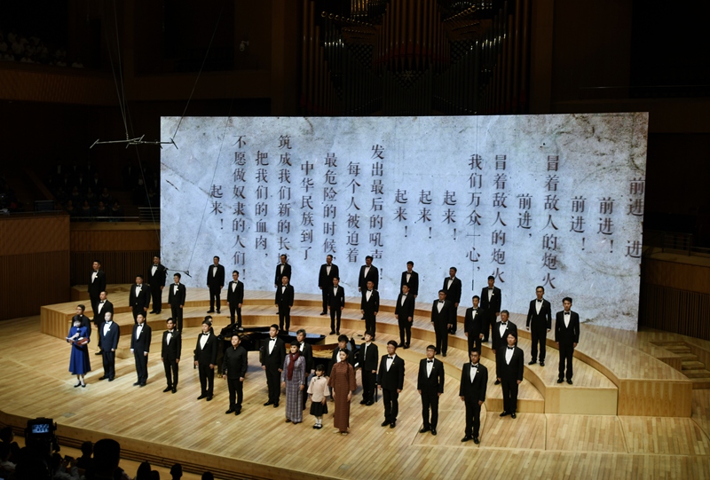 第一篇章《松花江上》以《長城謠》的泣血鄉(xiāng)愁與《義勇軍進(jìn)行曲》的全場肅立高唱,訴盡抗戰(zhàn)時期的流亡之痛與民族豪情,更創(chuàng)新植入“童年、少女、青年”三代“蕭紅”扮演者(張舒涵、鄭楚琪、尤泓斐)與合唱團(tuán)的情景互動。第二篇章《抗戰(zhàn)的烽火》中,《五月的鮮花》《露營之歌》《保衛(wèi)黃河》等作品以合唱與立體站位,緬懷趙一曼、楊靖宇等英烈,再現(xiàn)全民抗戰(zhàn)的壯闊圖景。第三篇章《文脈永續(xù)》則通過魯迅、茅盾等文學(xué)名家對蕭紅的評價、跨年代讀者代表致敬及《致祖國》的磅礴合唱,彰顯其文學(xué)精神在新時代的傳承。