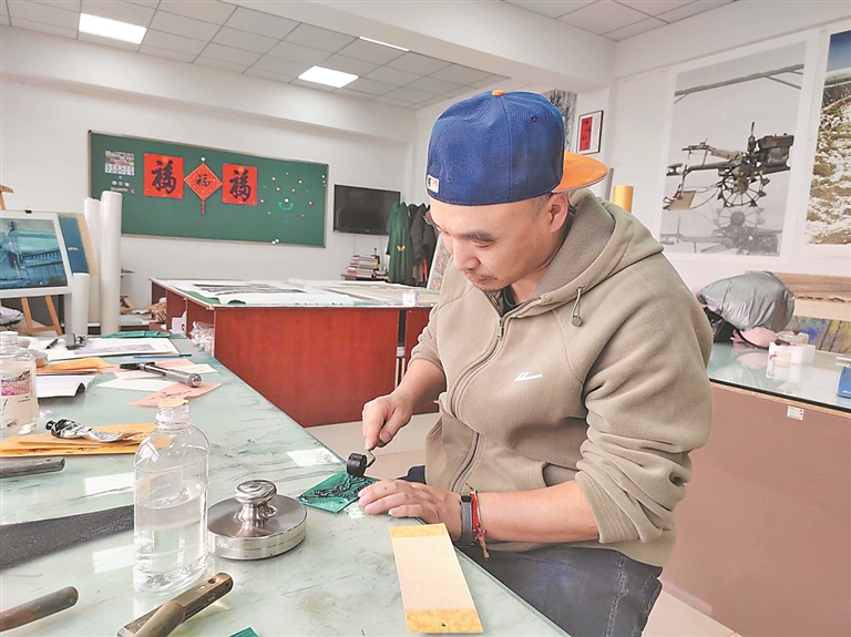 慶安版畫是黑龍江省非物質(zhì)文化遺產(chǎn)代表性項(xiàng)目,始于20世紀(jì)初。創(chuàng)始人吳盡臣將河北樂亭的木刻技藝帶到這片黑土地,最初以雕刻門神、福字等民俗圖案為主題,突出節(jié)日的喜慶和吉祥氣氛,表達(dá)人們對美好未來的企盼和追求。20世紀(jì)60年代中期,幾位著名的北大荒畫家到慶安工作,精心指導(dǎo)民俗年畫作者創(chuàng)作版畫,將慶安民俗版畫和北大荒版畫創(chuàng)作相互交融。歷經(jīng)四代傳承,吳蔚的父親吳玉林將題材拓展,用細(xì)膩刀法展現(xiàn)慶安的春播秋收、田園生活,在傳承中不斷創(chuàng)新;而吳蔚則把冰雪元素融入版畫創(chuàng)作,將千里冰封的壯美轉(zhuǎn)化為木板上的立體紋理?!袄献孀诹粝碌募妓嚥荒軄G,但作品題材和技法也要與時俱進(jìn),推陳出新?!眳俏当硎荆麄兊膭?chuàng)作團(tuán)隊不僅深入田間地頭、林海雪原采風(fēng),用刻刀記錄黑土地的獨(dú)特風(fēng)情,也緊盯時事熱點(diǎn),呈現(xiàn)新時代的主流價值。