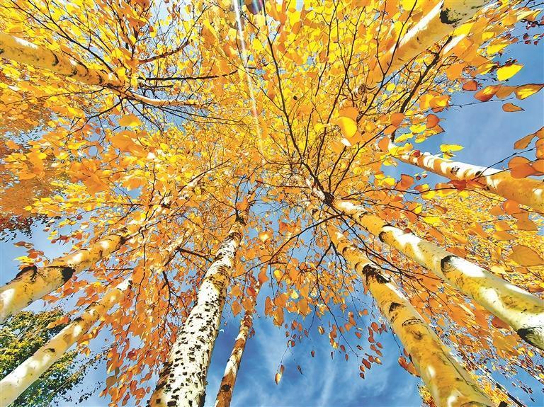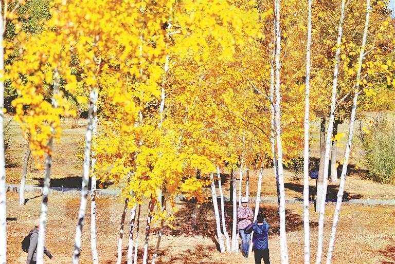 12日,哈爾濱市道里區(qū)麗江路附近的松花江畔,一小片白樺林吸引人們駐足觀賞、拍照。深秋的白樺樹(shù),樹(shù)干筆直高聳,樹(shù)皮潔白如紙。枝頭的葉子已經(jīng)由綠色變成了金黃色,在陽(yáng)光的照耀下,色彩濃重,景色迷人。本報(bào)記者 蘇強(qiáng)攝