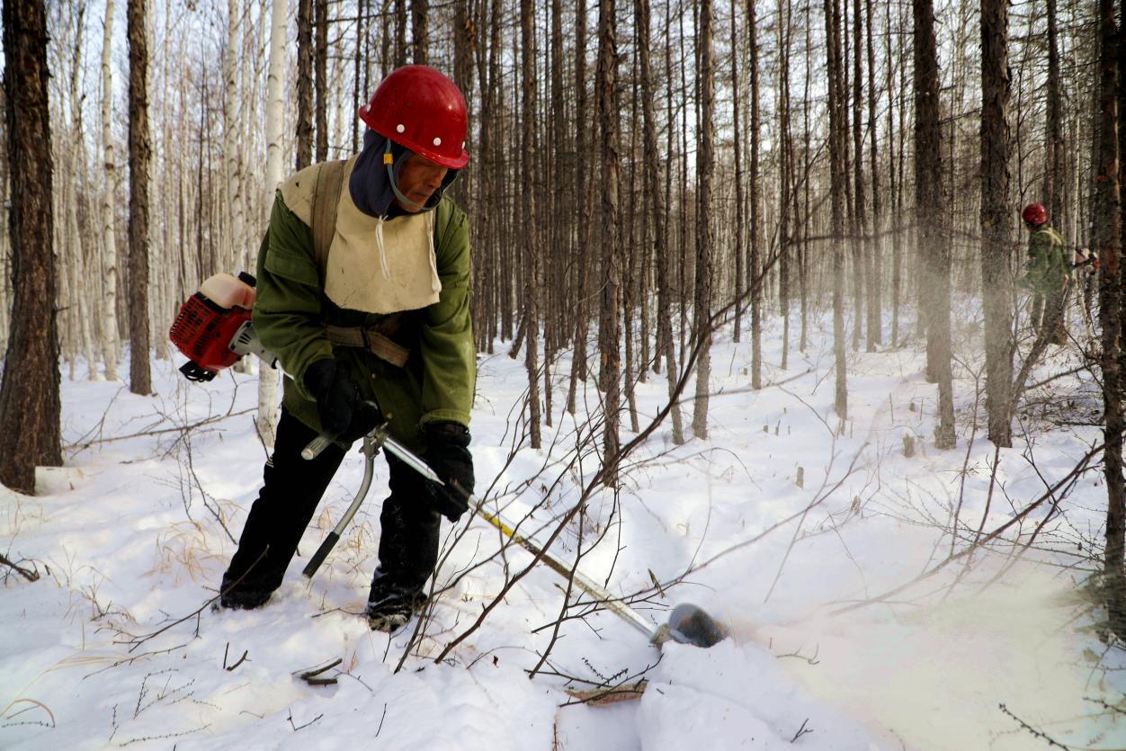 在凜冽寒風(fēng)中,這些“森林園丁”手持割灌機(jī)伐除病腐木、枯立木和風(fēng)折木等被害木,為目標(biāo)樹(shù)和保留木騰出更多生長(zhǎng)空間,以堅(jiān)守和付出守護(hù)著林海生機(jī)?!懊刻焓展せ貋?lái),鞋子、棉褲全是濕的,但看著樹(shù)木經(jīng)過(guò)修剪能茁壯成長(zhǎng),心中就充滿(mǎn)了成就感?!边B續(xù)9年參與冬季森林撫育工作的作業(yè)組組長(zhǎng)張國(guó)生,道出了所有撫育工作人員的心聲。