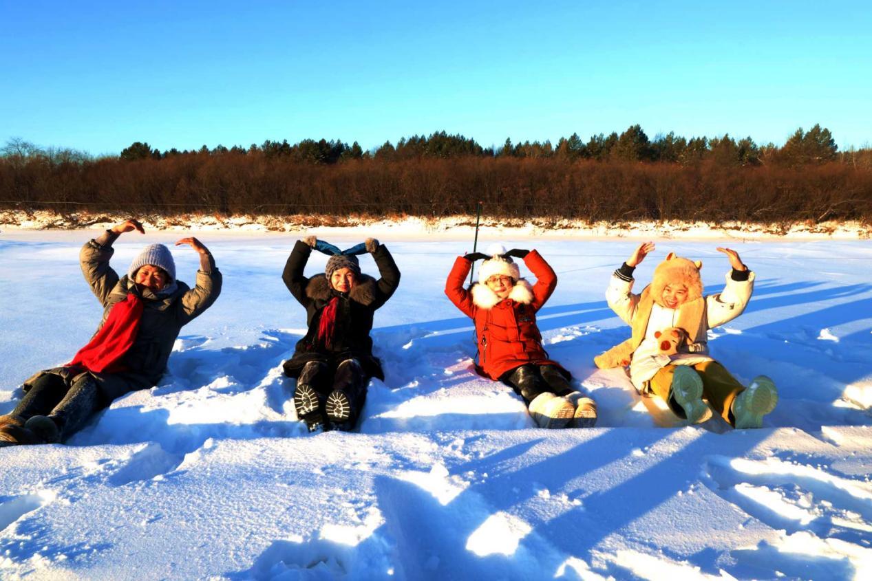黑龍江省詩詞協(xié)會采風(fēng)團成員在雙妃湖親身感受冰雪文化和驛站文化(王力 攝)