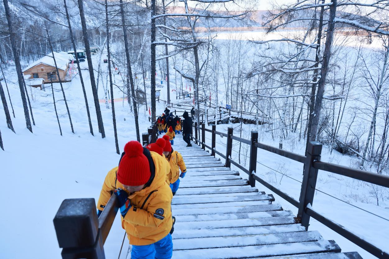 孩子們排成一串靈動的小隊,踩著積雪在棧道上噠噠前行,腳下“咯吱咯吱”的清脆聲響,為這場研學(xué)之旅奏響歡快序曲。軟糯的廣西口音此起彼伏,孩子們或好奇地觸摸棧道積雪,冰涼的觸感讓他們瞇起眼睛直跺腳;或緊緊抓著欄桿,任憑小臉凍得通紅,仍目不轉(zhuǎn)睛眺望遠方“Ω”形的冰封江灣,沉浸式感受北國冰雪的奇妙。那一抹抹跳動的橘色,在純白世界中宛如一團團小火苗,格外耀眼。