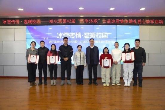 共青團(tuán)哈爾濱市委常委、哈爾濱青年宮書記、主任李晨,哈爾濱青年宮副主任李波瀾、陶萬軍,共青團(tuán)道里區(qū)委書記劉振,道里區(qū)教育局副局長張瑞珊,道里區(qū)慈善會(huì)秘書長韓杰、理事陳立紅、朱李梅、高晶,哈爾濱安陽小學(xué)黨支部書記、校長何國柱,四季沐歌集團(tuán)公益慈善委員會(huì)主席吳典華、品牌總監(jiān)李文平和哈爾濱第42屆公益冰雪集體婚禮的4對新人代表于源昊&朱松琪、胡印茁&郭燕芳、黃睿&李國芳、文得勛&蔡夢,共同參與這場溫暖的愛心捐贈(zèng)活動(dòng)。
